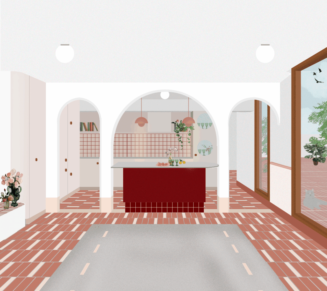 The colour burgundy acts as the guiding thread of the intervention throughout the house and it was the clients themselves who proposed it and expressed their desire to integrate it. Thus, the idea of a stroll, route or parade is reinforced: from the entrance, splashes of burgundy in the manner of furniture accompany the transit through the house until reaching the island where the family meets every day. Details in wood and the colour green in ceramics are also incorporated to balance the warm colour of the burgundy that is so present in the house.