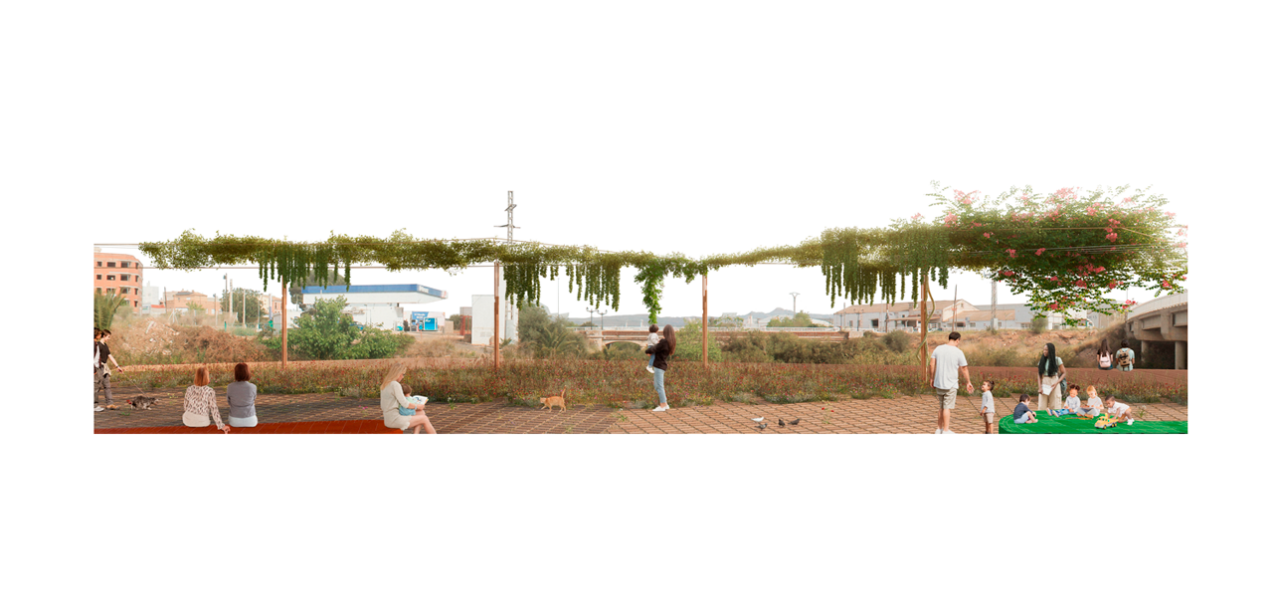 The proposal stems from the impressions the site and its surroundings offered during our initial visit and a detailed study of the needs expressed in the technical report. This fits into an ambitious project to enhance the banks of the Riu Sec throughout the municipality, reclaiming and bringing it closer to its residents. The name “River Walkways” harkens back to the children’s games in the old stream bed and nods to our benches as transition markers between the terraces, which in the same way can be a playground for today’s and tomorrow’s children. We see our proposal as a path integrated into the network of rural routes connected to the river, providing a space for community interaction, dotted with resting spots to relax, observe the natural surroundings, and learn: geometric elements that rise from the ground like sculptures, offering places to recline, interact, and rest. Additionally, a pergola serves as a filter between the urban core and the riverbank, creating a new window that frames the landscape. The welcoming plaza at the southern edge, with a pergola, fountain, and bicycle rack, also aims to be the entrance to the future building that will be developed in the existing house. It is located at the junction of various rural paths connected to the rivers, and with the fence of the plot removed but the existing trees preserved, it becomes a more welcoming, open, and safe space.