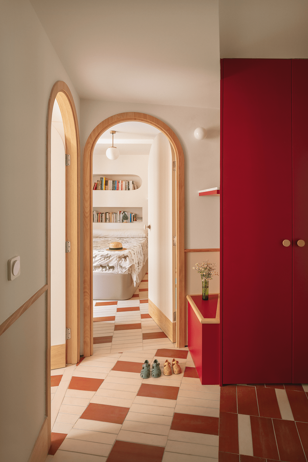 El color burdeos actúa como hilo conductor de la intervención a lo largo de la vivienda y fueron los propios clientes quienes lo propusieron y expresaron su deseo de integrarlo. Así, la idea de paseo, recorrido o desfile se refuerza: desde el acceso las salpicaduras de burdeos a modo de mobiliario acompañan en el tránsito por la casa, hasta llegar a la isla donde la familia se reúne cada día. Se incorporan también detalles en madera y el color verde en cerámica para equilibrar el color cálido del burdeos tan presente en la casa.